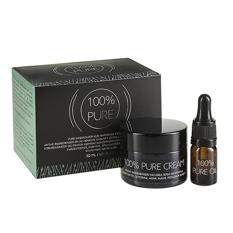 Vår produktserie «100% Pure» inneholder kun naturlige ingredienser. Aktive ingredienser er av høyeste kvalitet, dyrket i beskyttet miljø, fritt for forurensinger og FRI FOR: kjemiske konserveringsmidler, tungmetaller, GMO, fargestoffer, parfyme, emulgatorer og andre syntetiske kjemikalier.